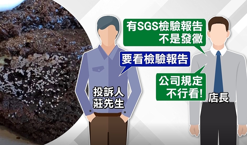 儘管已經吃了一口,莊先生趕快向服務人員反應,第一次服務人員道歉說回收,並端一盤新的蛋糕,但莊先生擔心下一塊蛋糕也發黴,服務生拿走蛋糕說回去報告就離開,這一等十分鐘,莊先生又再按了服務鈴,服務人員前來回應,店長說是糖霜不是發霉,還沒等到他們說話,服務人員就匆匆離開,莊先生又按了第三次服務鈴,這回店長親自出馬,說有檢驗報告沒有發霉,但卻拿不出檢驗證明。莊先生:「他們也堅稱,他們說有檢驗報告,檢驗報告是沒有問題這樣子,但這個檢驗報告,都不願意讓我們來看,這是讓我們覺得最懷疑的地方。」
