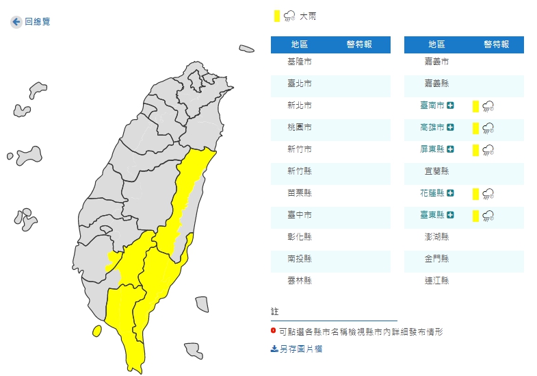 大雨特報地區包含:台南市、高雄市、屏東縣、花蓮縣、台東縣。