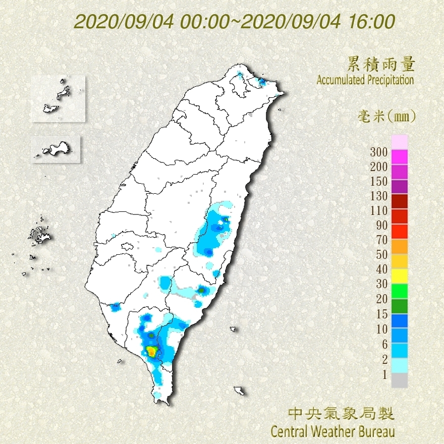 中央氣象局下午3時45分發布大雨特報,屏東、台東地區及台南、高雄、花蓮山區有局部大雨發生的機率,請注意雷擊及強陣風。