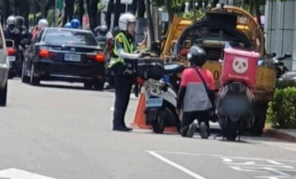 北市一名外送員今(5)日下午2時許,因違規在建國南路的人行道上騎車,被後方騎警用機車的女警撞見,將他當場攔下開單,沒想到外送員竟向女警下跪求情,雙方陷入僵持,最後一名好心路人剛好經過現場,從皮夾中拿出一千元給外送員,幫忙付罰金,才結束這場鬧劇。