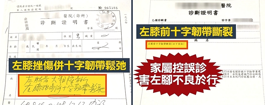 台中19歲陳姓騎士去年6月出了車禍後,在離家比較近的地方醫院就診復健,一直沒有痊癒,半年後到比較大型的教學醫院一看診緊急開刀,左膝十字韌帶斷裂,但是當時地方醫院的診斷證明,醫生只是寫「左膝十字韌帶鬆弛」讓爸爸氣的控訴地方醫院誤診延誤治療時間才害他的兒子不良於行。