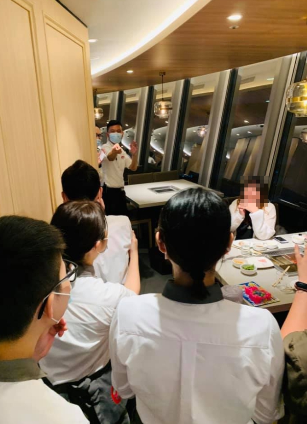 ▼海底撈十分貼心的安排了5位員工幫原PO的女同事慶祝。(圖/翻攝自爆廢公社)