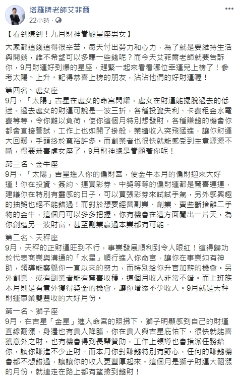 ▼艾菲爾在臉書分析9月財運超旺的星座。(圖/翻攝自艾菲爾臉書)