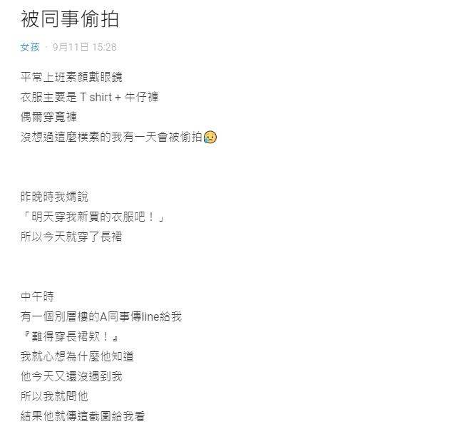原po將事情的經過娓娓道來,她首先說明平時的穿搭都是素顏、戴眼鏡,衣服都穿T-shirt配牛仔褲,相當普通,但「沒想過這麼樸素的我,有一天會被偷拍」,原po解釋,她最近穿了長裙上班,沒想到中午時,就有一位在別棟樓的同事密她表示「難得穿長裙唉」,這讓原po內心相當疑惑,明明沒見面,為什麼對方知道呢。