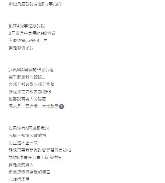 被同事偷拍該怎麼辦?近日一名女網友就在網路上訴苦,透露平時上班穿著樸素,結果成為同事取樂目標,她發現一名不讓她加臉書好友的同事,在上面放了滿滿自己照片,更誇張的是,該名同事還會把偷拍的照片傳給其他人分享,讓原po相當氣憤,引起大家討論。