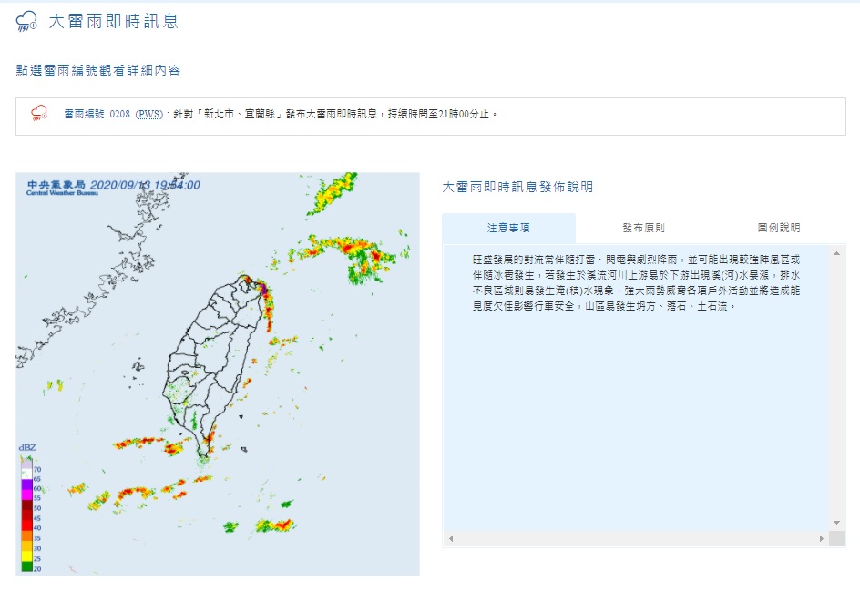 氣象局指出,豪雨特報地區包含基隆市、新北市、宜蘭縣,此外台北市也發大雨特報。宜蘭縣頭城鎮今晚間9時許也發布「淹水一級警戒」,觀測大里國小3小時雨量172毫米,如持續降雨轄內易淹水村里及道路可能已經開始積淹水,包括頭城鎮-中崙里、二城里、下埔里、大坑里、竹安里、中埔里、頂埔里,建議民眾即時進行淹水通報及應變。