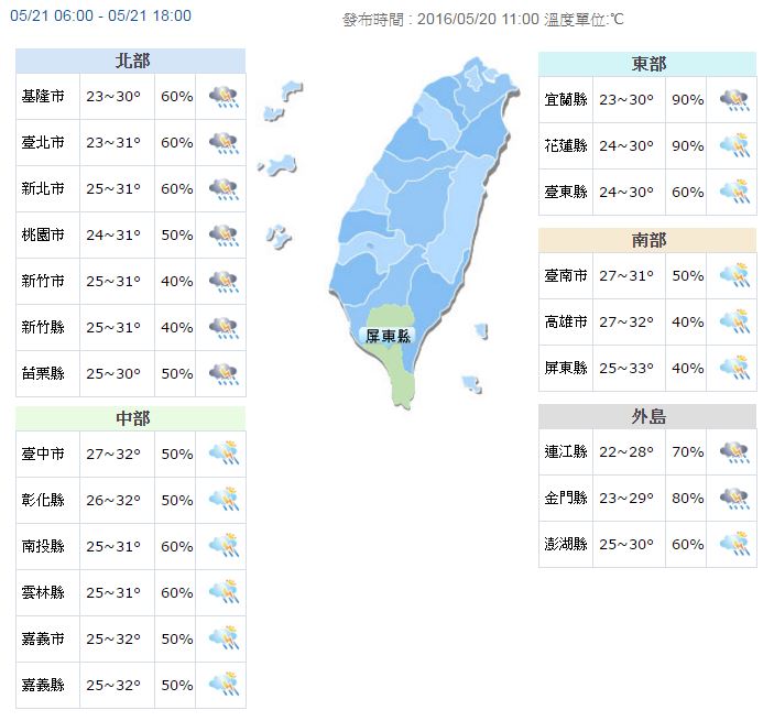 根據中央氣象局表示,21日開始,連續三天受到鋒面的影響,全台各地將有有短暫陣雨或雷雨,尤其西半部地區易有局部大雨發生。