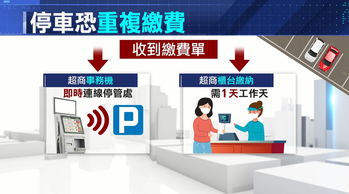很多民眾拿到停車繳費單後會到超商繳納,但如果是選擇在櫃檯繳費,系統需要一天的工作時間補登,也就是說繳費後,24小時內再到超商的事務機(ibon)查詢,就會顯示未繳款,導致有些人出現重複繳費的狀況,以台北市為例6年來,超繳費用竟然高達4千多萬。