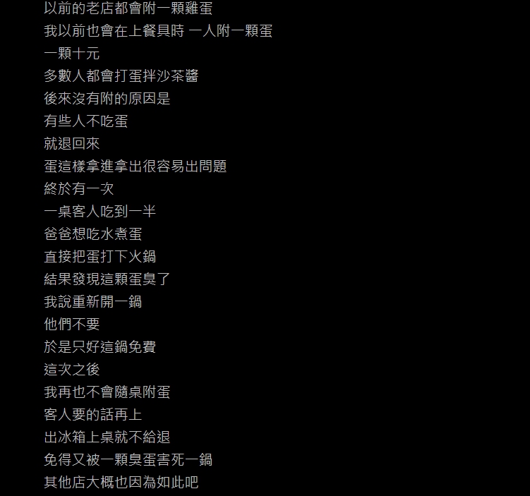 這位網友說明「蛋拿進拿出很容易出問題」,還分享了之前有遇到客人想吃水煮蛋,沒想到下鍋後才發現蛋根本都臭掉了,於是該名網友提議要幫對方再開一鍋,但卻被拒絕,最後只好讓客人免費「這次之後,我再也不會隨桌附蛋了」,他分析其他家火鍋店應該也是因為一樣的原因,所以後來才不提供附蛋的服務。