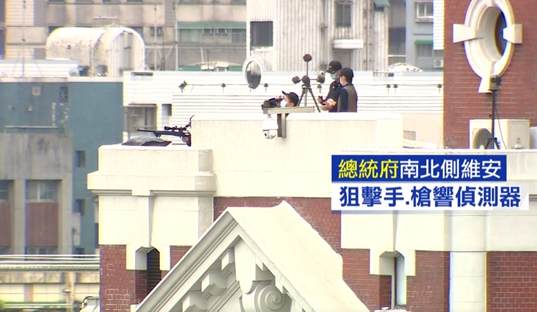 總統府南側及北側,狙擊手趴臥高點戒備不能少的,一旁還有配置槍響偵測器,國慶典禮維安等級全面提升。