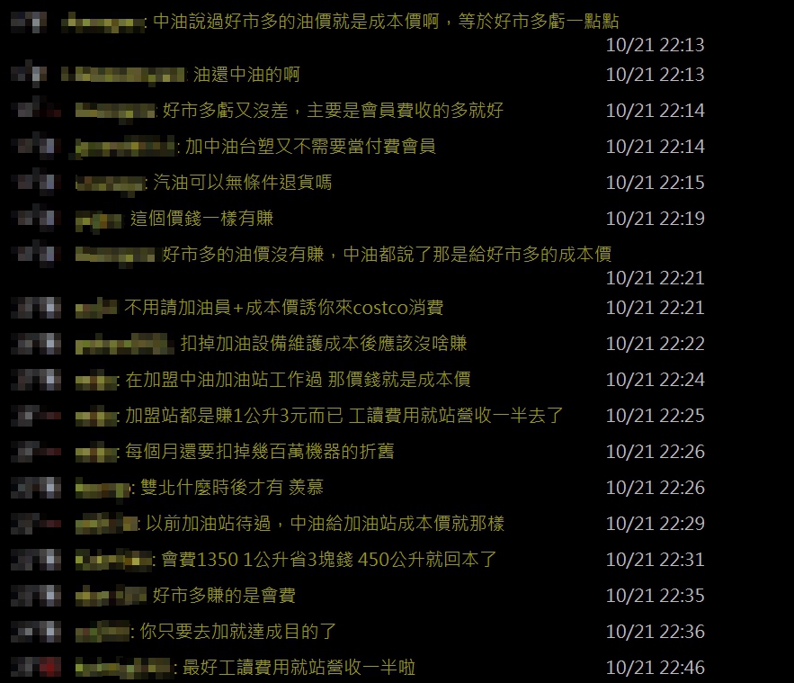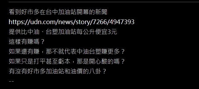近日一名網友在PTT上發文表示,他看到台中好市多加油站開幕的新聞,裡面提到好市多的油竟然比中油和台塑加油站每公升便宜3元「這樣有賺嗎?」,同時也問到,如果賣場賺錢了,這樣不就代表中油和台塑賺得更多,但若只是打平甚至虧本,這樣不就是開辛酸的嗎?