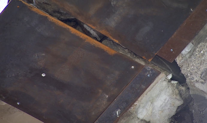 ▼鋼板釘在橋梁伸縮縫下方,因為石塊多半從這裡掉下來。(圖/東森新聞)