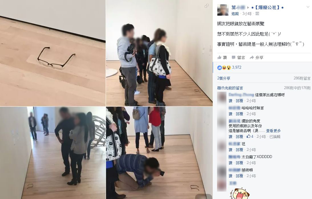 展覽的木頭地板上擺著一副粗框眼鏡,沒想到引來大批民眾駐足觀賞,更誇張的是,有人拿著相機,特意跪地拍攝,PO照的葉姓網友表示「事實證明,藝術總是一般人無法理解的!」