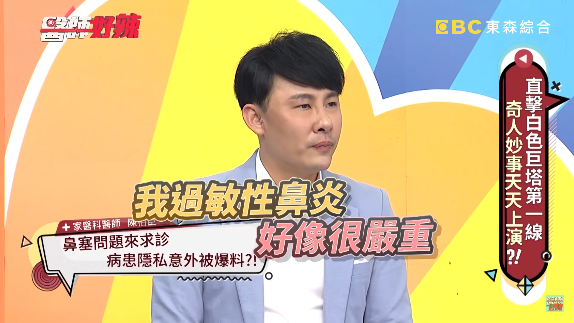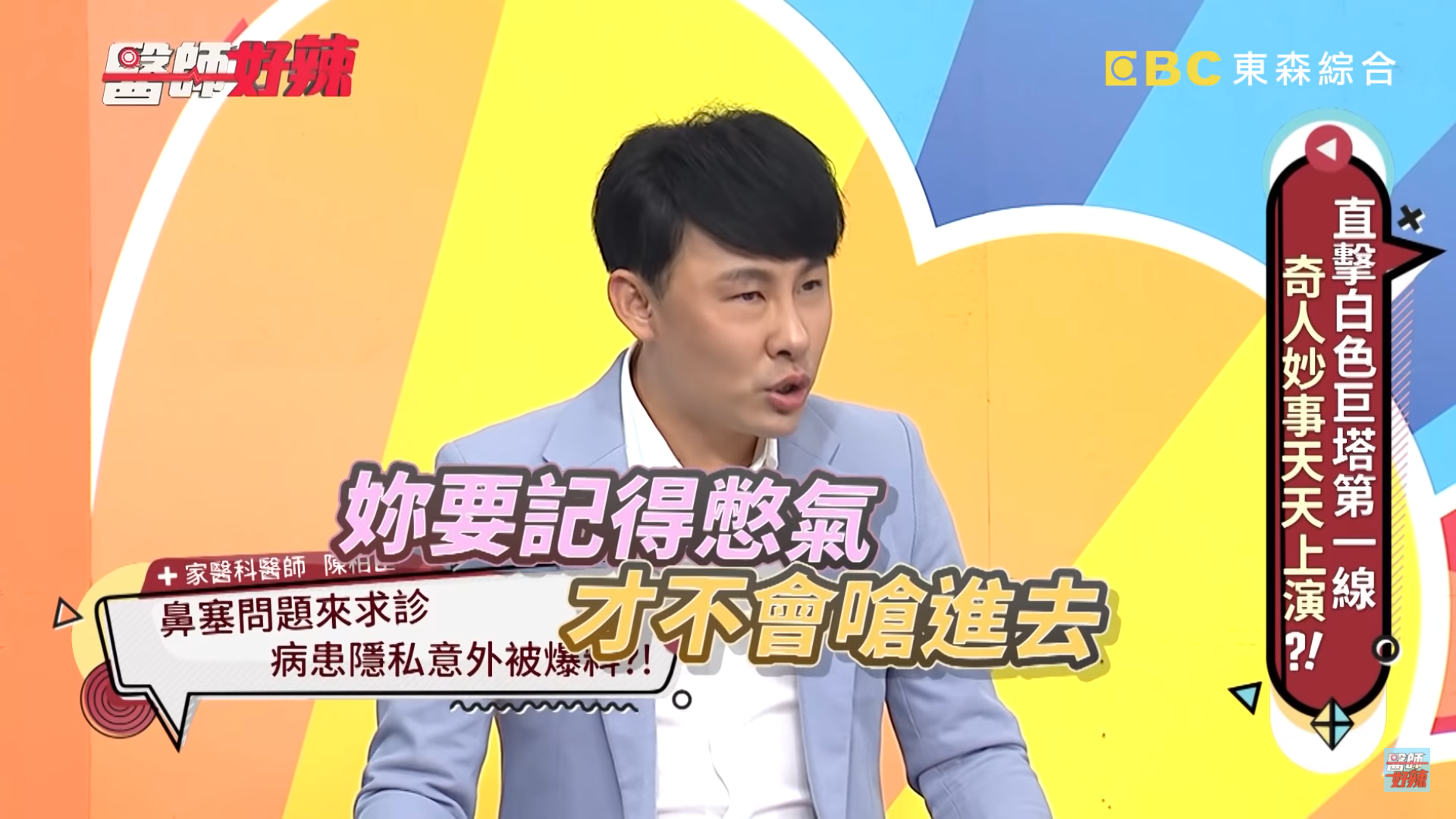家醫科醫師陳柏臣近日上節目《醫師好辣》,談到先前有位患者求診表示自己的過敏性鼻炎相當嚴重,試了多種方法都無法改善,不過醫生進一步詢問卻發現患者只有「單邊鼻塞」,但按常理過敏性鼻炎多為「雙邊堵塞」,因此便邀請耳鼻喉科醫師一同看診,診斷後發現病患鼻腔內長了菜花,不料一旁的友人竟脫口而出:「他那麼喜歡O妳臉上,要記得憋氣才不會嗆進去」,意外爆料閨房情趣,讓在場的醫師、護士都一陣尷尬。