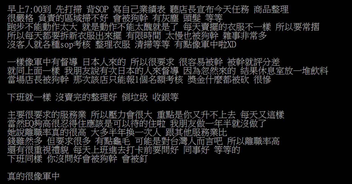 SOP,但Uniqlo是日本商,所以「照表操課」的情況又比其他外商嚴格,其中像是打卡要和同事互相問好,拆新衣上架也有標準時間,連休息室也不可以堆放一堆飲料「真的很像軍中」,因此很多人受不了。網友透露,朋友做了1年半,大約半年就換一批新同事。原PO還說,「早上7:00到班,先打掃,然後背SOP,接著寫自己業績表、聽店長宣布今天任務、商品整理」。雖然說升遷管道算是通順,但在要求這麼嚴謹的情況下,在店內若是人緣不好,那升遷之路也就跟著無望。