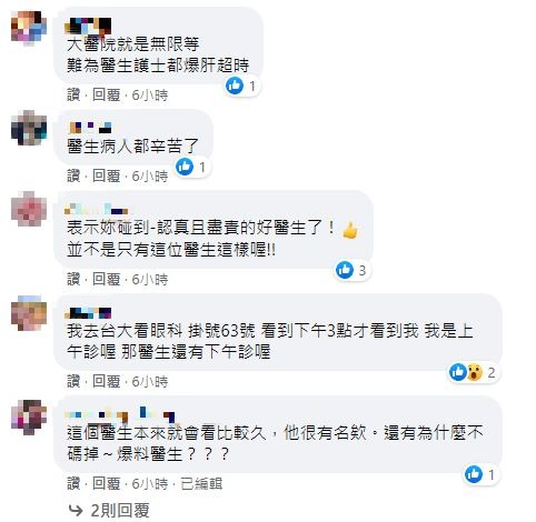 原PO的貼文一貼出後,立刻引起熱烈討論,PO出14個小時就獲得2000多個按讚數,且有300多個網友回應,紛紛驚嘆醫護人員的辛勞,「大醫院就是無限等,難為醫生、護士都爆肝、超時」、「醫生、病人都辛苦了」、「這個醫生本來就會看比較久,他很有名」。另外,也有網友分享自己的經驗,「我曾經看診看到凌晨三點,是七點開始的夜診」、「有一次晚診75號看到凌晨一點,醫院冷氣都關了」。