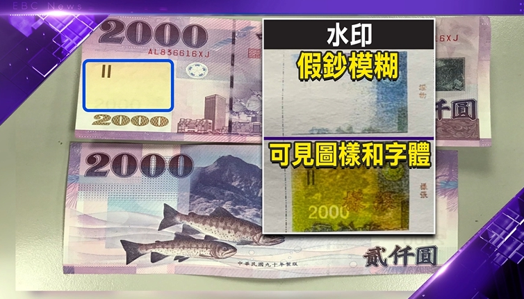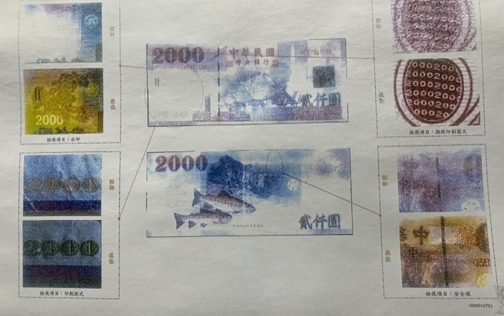 用機器放大後,假鈔圖文模糊,真鈔清晰,假鈔浮水印看不到背後圖騰「2千元的數字」,真假鈔顏色明顯不同,假鈔的安全碼也不像真鈔清晰可辨別,這次偽鈔集團鎖定較少見的2千元鈔票,大量印刷流入市面,警方也嚴防透過賭場進行洗鈔。