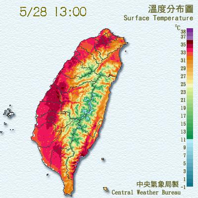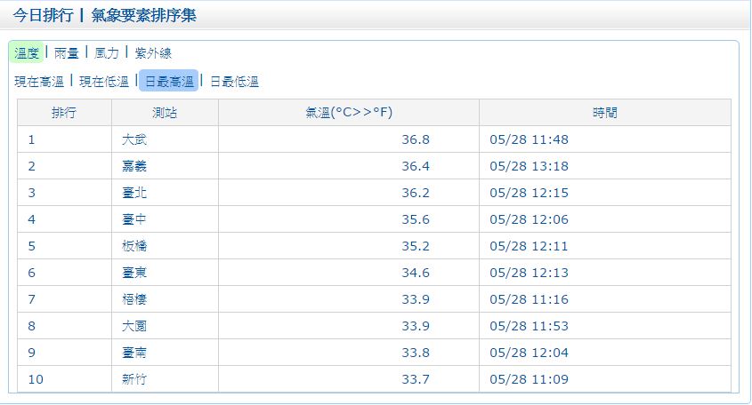 天氣,戶外活動請注意防曬並多補充水分,此外,由於西南風過山沉降增溫作用,東南部地區易有焚風發生,上午11時48分大武已有焚風出現。台北目前最高溫是12時15分的36.2度,嘉義在13時18分也出現36.4度高溫。