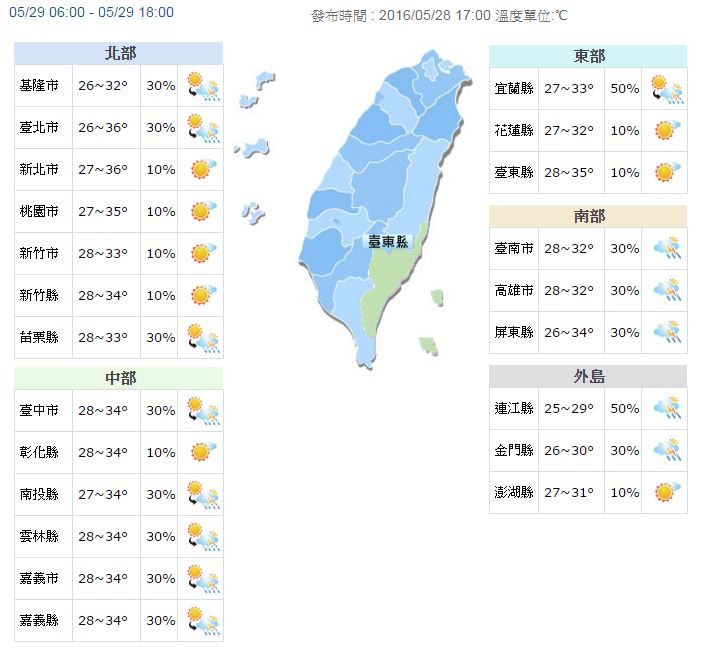 ,西半部最高溫約34到36度,宜、花一帶則在32、33度左右。