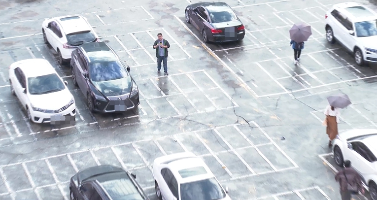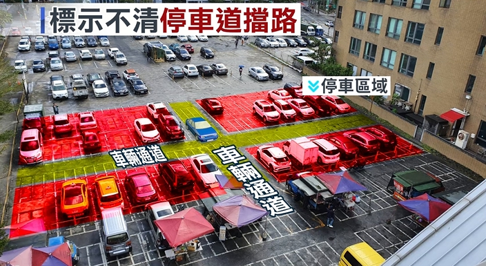 停車場內,乍看之像是機車停車格,但其實這是一個停車場,左右兩邊都停滿了車,但因為底下機車停車格的標線並沒有完全塗銷,因此容易造成駕駛人的誤會。而當時這輛藍色轎車就停在通道上,擋住後方車輛進出,看在其他駕駛眼中,認為不常來這邊停車的人,可能會被標線誤導。其他停車駕駛:「他有一些塗銷啦,但是他後面新畫的(標線),就他黑色塗銷消失之後,就變得好像很多格子。」