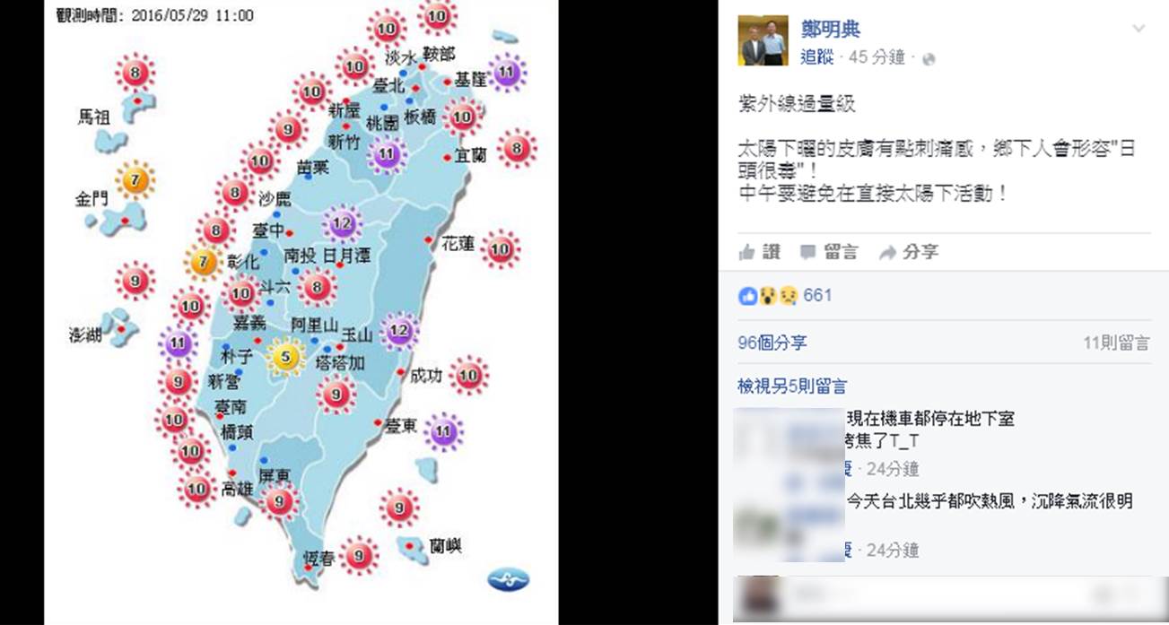 中央氣象局預報中心主任鄭明典稍早也在臉書PO文,指出全台紫外線過量,太陽下曬的皮膚有點刺痛感,鄉下人會形容「日頭很毒」且提醒大家,中午要避免在直接太陽下活動!最近晚上蚊子較多,鄭明典也在臉書提醒大家,老人家說,蚊子變得兇,就是快下雨了,預報上是指午後對流發展,白天溫度仍高。