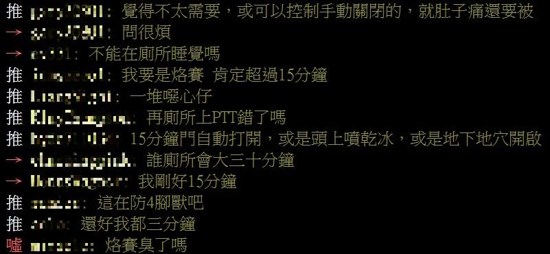 而近日北捷則是說明清潔人員都會注意大家的如廁時間,原則上超過15分鐘,就會通報站務人員關心。消息曝光後,立刻在PTT引起熱烈的討論,不少鄉民認為15分鐘的時間可能不夠用,紛紛吶喊「我便秘怎麼辦?」、「我要是烙賽,肯定超過15分鐘」、「就便秘了還要被煩」、「15分鐘太短了吧!」、「有時候烙賽會一波未平一波又起,15分鐘怎麼夠!」、「每次都20mins以上」、「我覺得20分鐘差不多?有時候真的要比較久」。