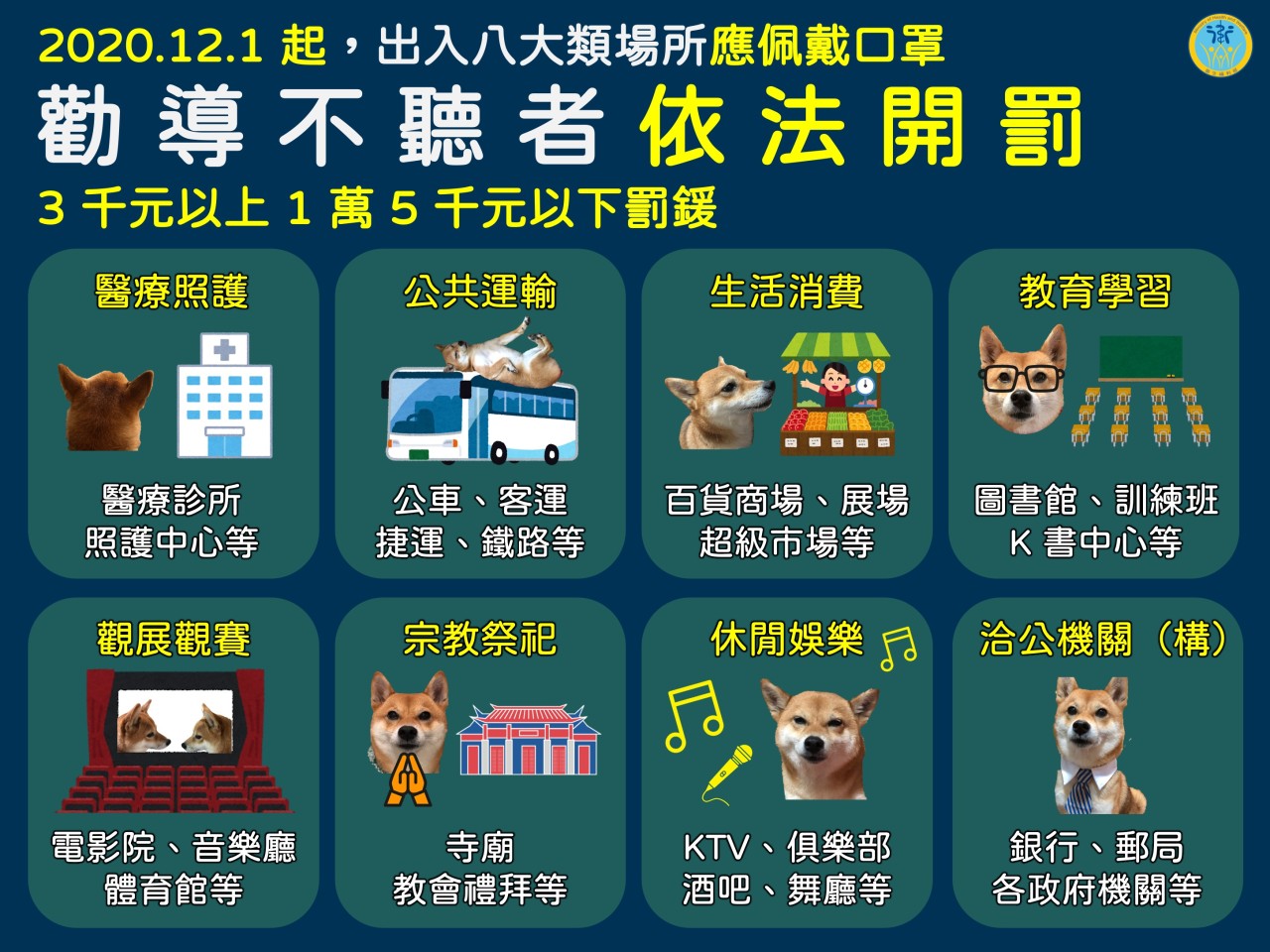 而為了降低呼吸道傳染病的感染與傳播,及避免過度耗用醫療資源,也開始強制要求民眾進入「醫療照護、大眾運輸、生活消費、教育學習、觀展觀賽、休閒娛樂、宗教祭祀、洽公」等8大類場所應配戴口罩,違者經勸導不聽,可處新台幣3,000元至1萬5,000元罰鍰。