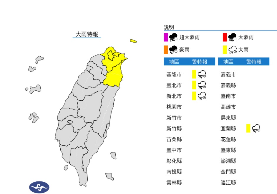 東北季風影響,中央氣象局說明,今(2)日宜蘭縣已有豪雨發生,基隆北海岸、宜蘭及大台北地區有局部大雨發生的機率,連日降雨,山區請注意坍方及落石,低窪地區請慎防淹水。