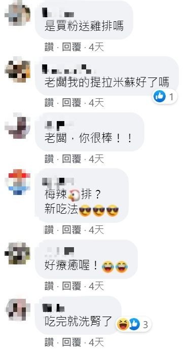 老闆PO出照片後,立刻引起熱議,發文至今5天已累計1.2萬個按讚數,且有近600多位網友回應,表示「這是在吃粉吧!」、「看著看著鼻子都癢癢的」、「是買粉送雞排嗎?」、「老闆我的提拉米蘇好了嗎?」、「吃完就洗腎了」、「你的顧客好重量級口感!」、「好療癒喔!」