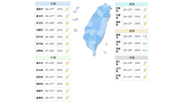 降雨部分,今天仍有機會出現午後雷陣雨,不過降雨區域大多在山區及近山地帶,還可能順著風向影響到東半部地區,所以中午過後在山區及東半部地區活動的民眾要多加注意天氣變化,防範瞬間降雨。而在迎風面的南部地區於清晨至上午也有可能出現短暫陣雨,不過降雨時間不長、區域也不多。