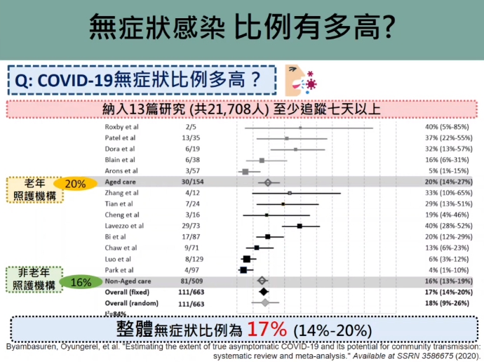 ▼無症狀個案整體比例為17%,最高到40%,最低為4 %。(圖/翻攝自新冠肺炎科學防疫園地 youtube)