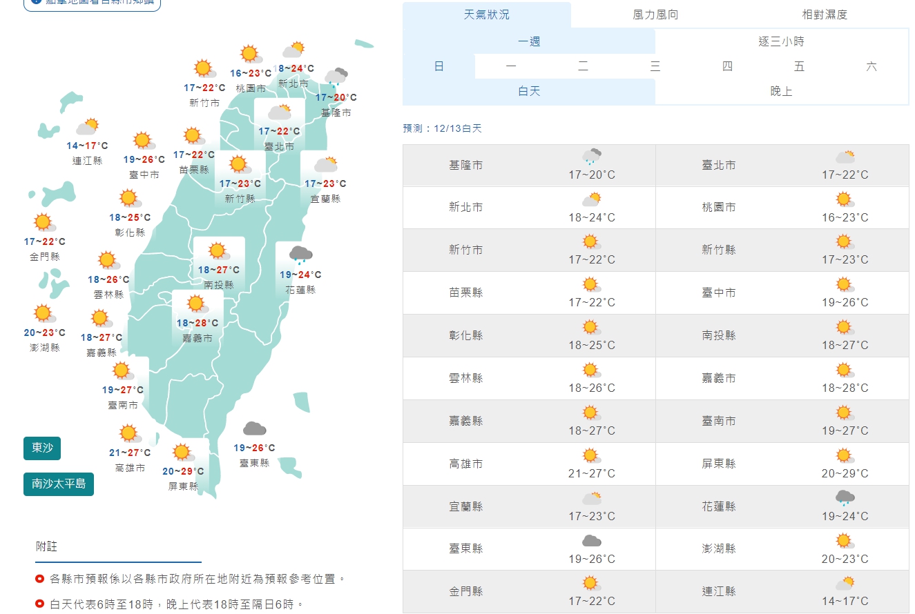 另外一方面,吳聖宇今(12日)上午於臉書粉專「天氣風險 WeatherRisk」指出,東北季風於今明兩日稍微減弱,在此空檔水氣減少、溫度也稍微回暖;北台灣白天的高溫,有機會回升到22至23度以上,中部及花蓮可到24至26度,而南部及台東高溫有26至28度。吳聖宇提醒,中南部日夜溫度變化較大,早出晚歸仍要注意溫差的情況。