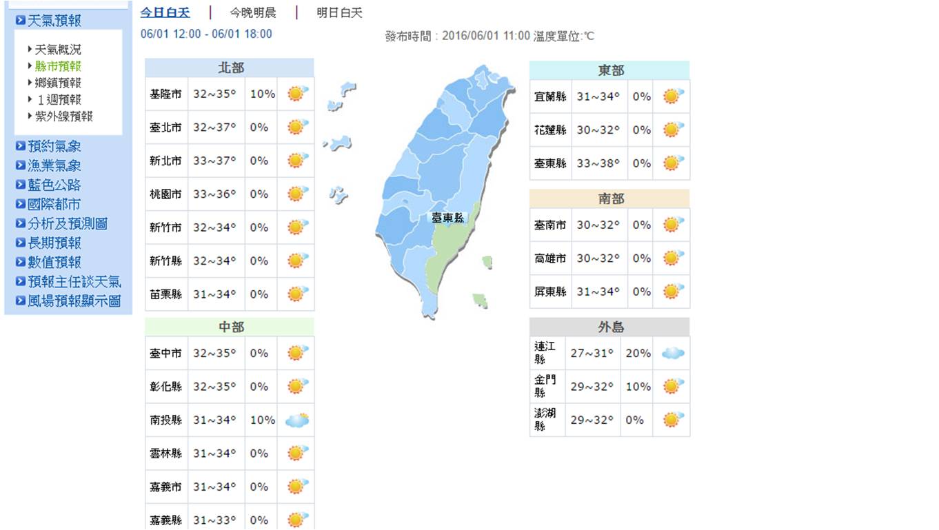 中央氣象局表示,今天天氣型態與昨天類似,因持續受到西南風影響,加上太平洋高壓勢力偏強,各地大多為晴到多雲、高溫炎熱的天氣,北部白天最高溫上看37℃,甚至超過37℃,午後各地山區及東部地區有局部短暫雷陣雨。也因為西南風較強,所以東南部有焚風,台東在早上11點16分,已經出現38.2度高溫,氣象局提醒,有可能出現更高溫的