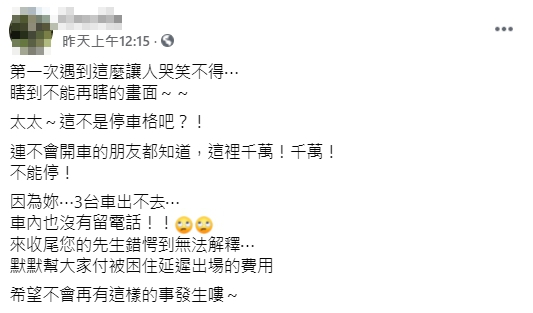 原PO傻眼表示,連不會開車的朋友都知道,這裡千萬不能停,傻眼的說「因為你,當時有3台車出不去」,車內也並未留下任何聯繫方式,最後無奈報警處理,這才連繫上車主的丈夫,不過有趣的是,原PO還原當時對方丈夫來收尾的表情,「您的先生錯愕到無法解釋」,最後默默掏錢幫大家付延遲出場的費用,讓她忍不住表示「瞎到不能再瞎」。