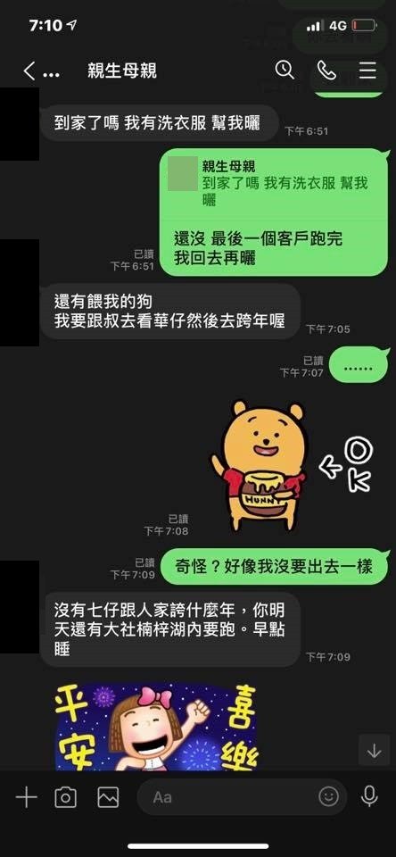 從原PO截圖的對話中可以看到,媽媽先是問他「到家了嗎?」再馬上接著告訴他家中有洗衣服,回家記得要幫忙曬,而原PO則回應自己還有最後一個客戶還沒跑完,晚點回家再曬,沒想到媽媽並沒有關心他幾點要回家,馬上又接著告訴他下一件要做的事,「還有餵我的狗」,最後再告知原PO,她要跟朋友出門跨年,而原PO則表示「奇怪?好像我沒有要出門一樣」,豈料媽媽竟大吐槽「沒有七仔(女友)跟人家跨什麼年」,更不忘提醒原PO明天要上班,且「還有大社楠梓湖內要跑,早點睡」,讓原PO不禁感嘆跨年當天忙到很晚,沒人約跨年就算了,「還要被這位小姐取笑一下」,讓他相當無奈。