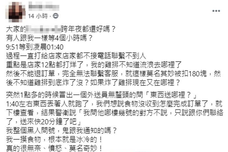 女網友在臉書「爆怨公社」發文,昨(31)晚叫180元的雞排外送,刷卡付款後竟從下單的21點51分一直等到隔年凌晨1點40分,期間原PO不斷打給店家也無人回應,就連想要取消訂單也無法,讓她進退兩難,無奈的表示,「重點是店家12點都打烊了,我的雞排不知道流浪去哪裡了?」,聯絡不到客服,也無法取消訂單。