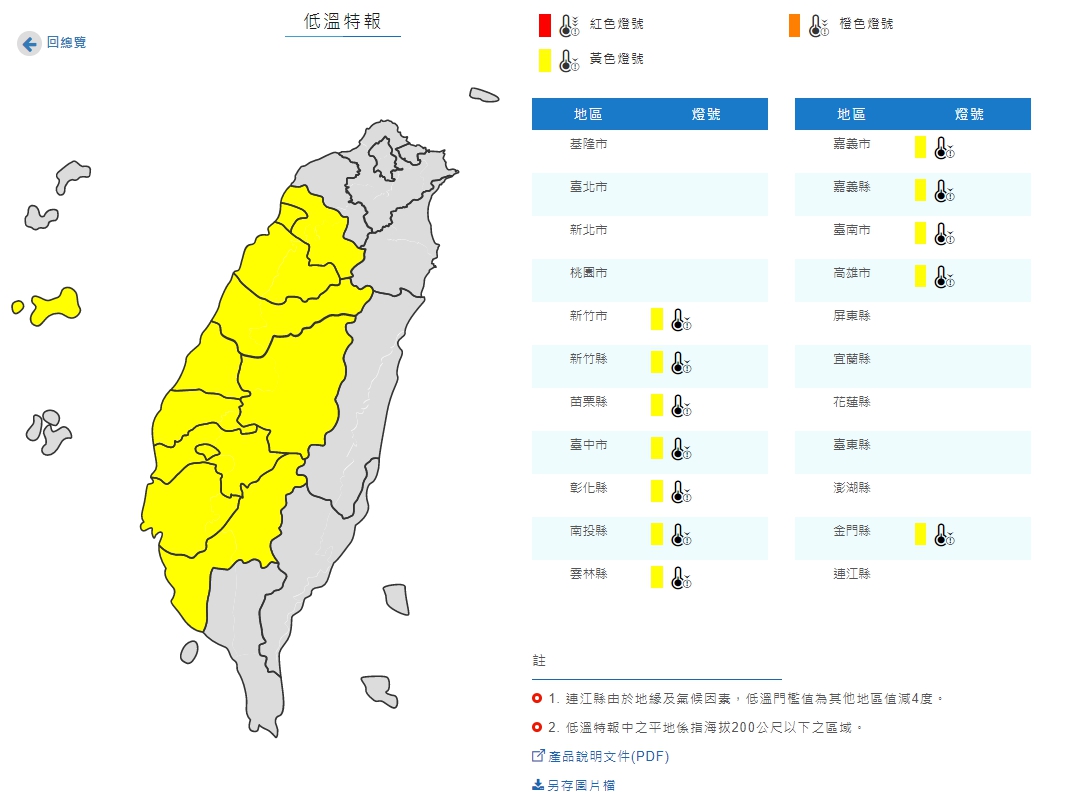 氣象局仍持續發出低溫特報,受輻射冷卻影響,各地早晚氣溫明顯偏低。今天晚間至明天上午局部地區有10度以下氣溫(黃色燈號)發生的機率,請注意。低溫區域為新竹市、新竹縣、苗栗縣、台中市、彰化縣、南投縣、雲林縣、嘉義市、嘉義縣、台南市、高雄市、金門縣有10度以下氣溫發生的機率,請注意。