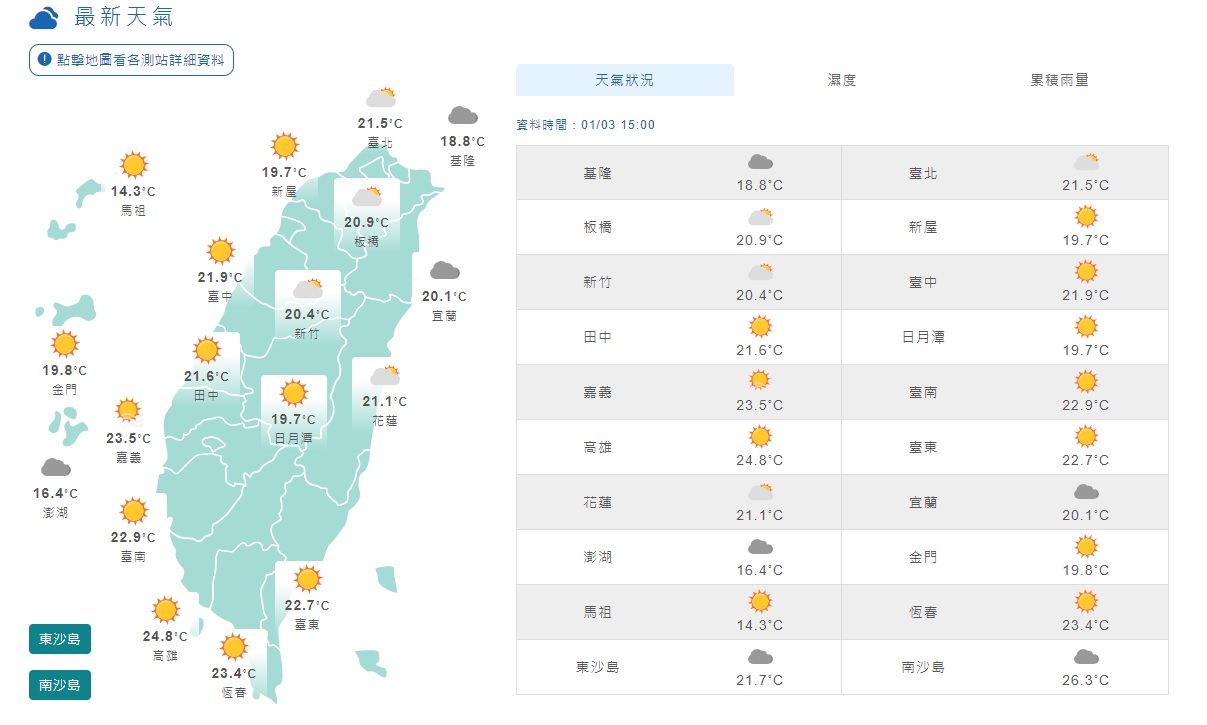 中央氣象局表示,3日清晨輻射冷卻效應明顯,氣溫仍低,西半部低溫8至14度,桃園以南部分地區都有10度以下低溫出現,東半部及高屏地區約14、15度,白天冷空氣持續減弱,北台灣高溫回升到20至22度左右,中部及花東地區23、24度,南部則可以來到25、26度,西半部日夜溫差大;天氣方面,只有北海岸、東半部地區及大台北山區偶有零星降雨,其他地區為多雲到晴的天氣。