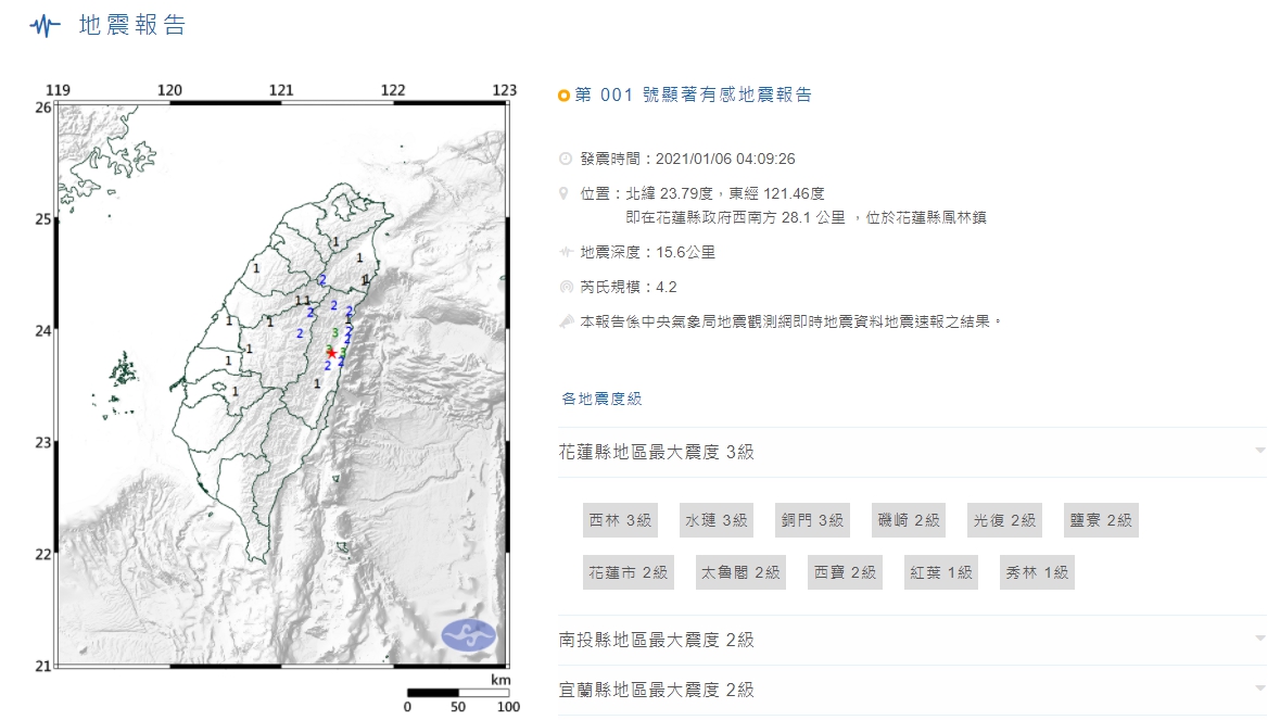 根據中央氣象局最新資訊,今(6)天凌晨4時09分發生芮氏規模4.2的地震,最大震度為花蓮縣3級;隨後過了2分鐘,花蓮又於4時11分發生芮氏規模4.2地震,地震深度14.1公里,震央位於花蓮縣政府西南方28.6公里(位於花蓮縣鳳林鎮),最大震度花蓮縣4級。