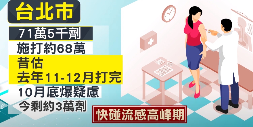 據了解,台北市這次共買約71萬5千劑流感疫苗,目前已施打約68萬,只是原本一開始民眾踴躍施打,當時預估去年11至12月就能打完,但自從10月底爆發疑慮之後施打數量銳減,今剩約3萬劑,議員也憂心不久後就會碰上流感高峰期。