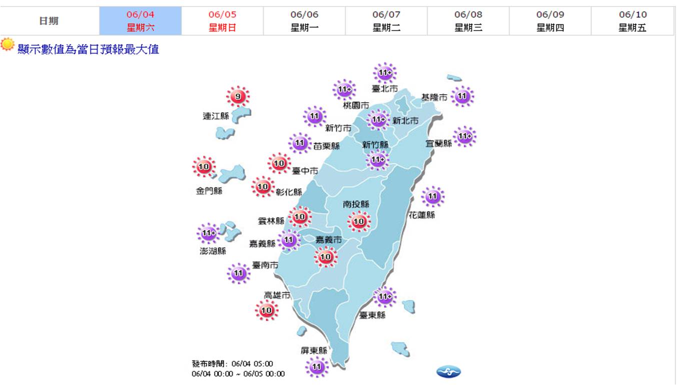 ●全台各地今(4)日紫外線預測 (圖/中央氣象局)