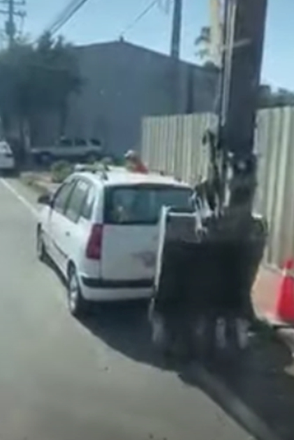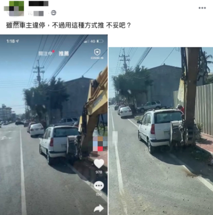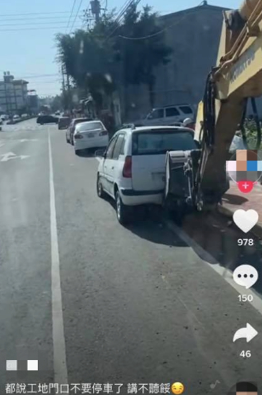 今(11)日一名網友將一段抖音影片上傳至臉書社團「爆料公社二社」,寫下「雖然車主違停,不過用這種方式推,不妥吧?」只見影片中有輛白色轎車停在路邊白線內,白色轎車前面也有停好幾輛小客車,但這時一台怪手出現,直接把白車往前推,旁邊還有一名男子幫忙指揮,影片說明寫著「都說工地門口不要停車了,講不聽餒」。