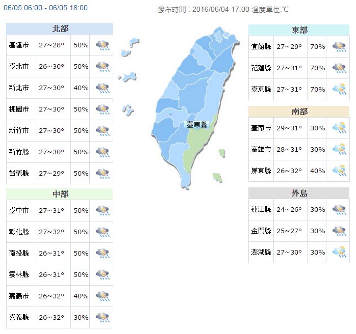 溫度方面,雲層量多加上鋒面南壓風向轉變,各地氣溫都較昨日下降,白天感受舒緩許多,北部東半部高溫在30度上下,中南部則約32、33度,沒下雨時可能稍感悶熱,清晨夜晚低溫則在25、26度間,感受舒適。