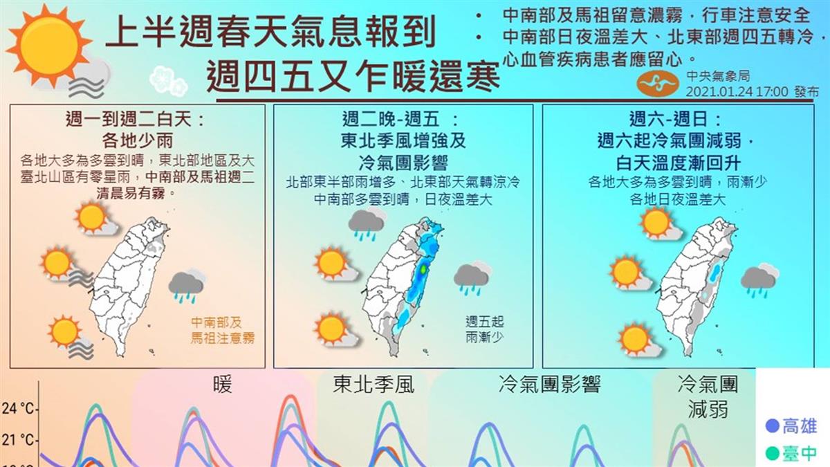 另外,中央氣象局也表示,到周三前各地天氣穩定,僅有東半部有零星降雨,周三至周四東北季風增強,這北部降雨機率提升;周四會有大陸冷氣團南下,還不確定是否會達到強烈大陸冷氣團,周五一整天至周六清晨最冷,屆時中部以北、宜花低溫約在10-12度、其他地區13-14度,空曠地區可能還會再降2度左右。