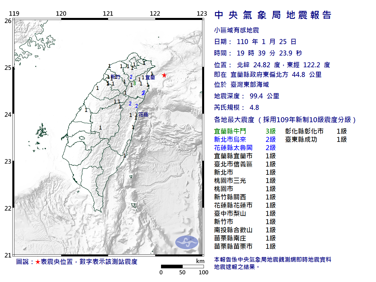 有地震!中央氣象局指出,今(25)日晚間7點39分,發生規模4.8有感地震,震央位於宜蘭縣政府東偏北方44.8公里,地震深度99.4公里,最大震度宜蘭縣3級。