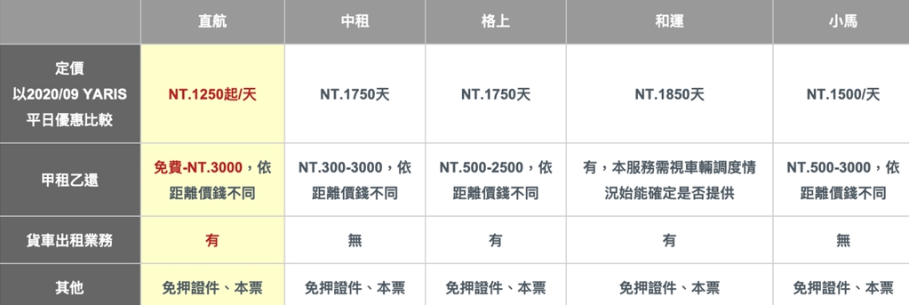 如果你問我,我的租車原則是什麼?CP值可以算是我的首選,然後取車還車的方便性排第二。我在網路看到這一張統計表格,才拍板決定給直航租車一次機會!