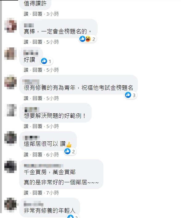 該名考生的用字遣詞相當有禮貌,且對方竟然願意在被吵到的情況下主動離開家裡,反應讓原PO感到意外不已。貼文PO出後立刻引起網友討論,大家紛紛表示「這種話說出來,讓人感受就很好」、「好家教」、「想要解決問題的好範例」、「千金難買好鄰居」,吸引了3.5萬人驚訝按讚,原PO也在最後感謝對方的體諒,雙方完美的解決了問題。