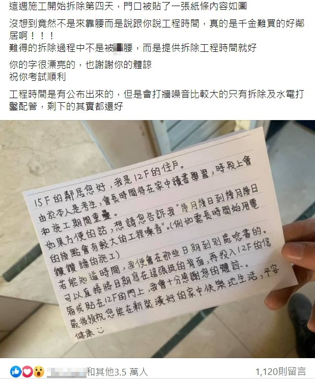 「真的是千金難買的好鄰居啊!」一名網友日前在臉書社團「爆廢公社二館」發文表示,住在15樓的他表示最近家裡在施工,目前已經開始拆除到第4天,沒想到卻發現門口被貼了一張紙條,原本原PO以為對方是來罵他太吵,結果竟然是希望他能提供工程時間。從原PO貼出的照片來看,寫紙條的人是12樓的鄰居,且字體相當工整。
