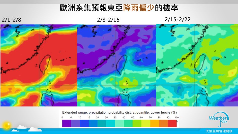 針對春節連假的天氣狀況,賈新興依照目前的資料指出,2月8日前的天氣狀況較為穩定,不過這也讓西半部的水情欠佳,小年夜(2月9日至10日)預估會有一波鋒面通過台灣,鋒面的強弱和降雨狀況還有待觀察;東北部在除夕夜時,可能會有雲量偏多的情況,屆時可能會有毛毛雨,其他地區的天氣大致穩定。