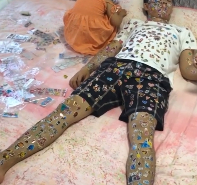不論是爸爸的手腳、衣服還是褲子,甚至整張臉全部都聽著密密麻麻的貼紙,仔細一看,小娃就連脖子也不放過,女兒一臉開心地樣子,也讓爸爸捨不得阻止,只好躺在床上淡定的滑手機休息,這一幕也讓原PO看了笑翻,「想騙你們生個孩子,但是說服力太低了。」